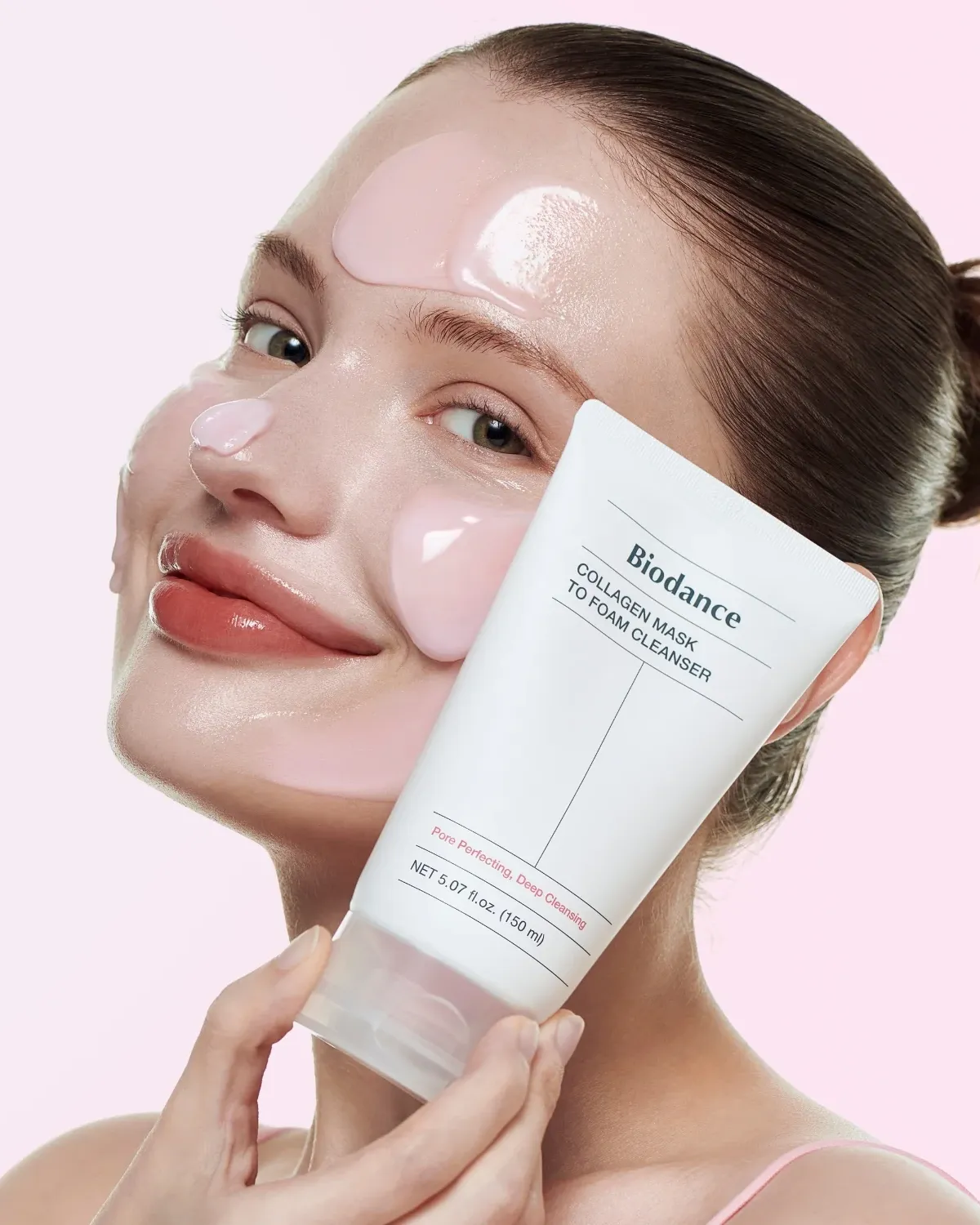 Biodance Collagen Mask to Foam Cleanser este un produs 2 în 1 care combină beneficiile unei măști cu eficiența unei spume de curățare. Formula sa absoarbe sebumul în exces, dizolvă firele sebacee și impuritățile fără a provoca iritații sau uscăciune, menținând echilibrul natural al pH-ului pielii.