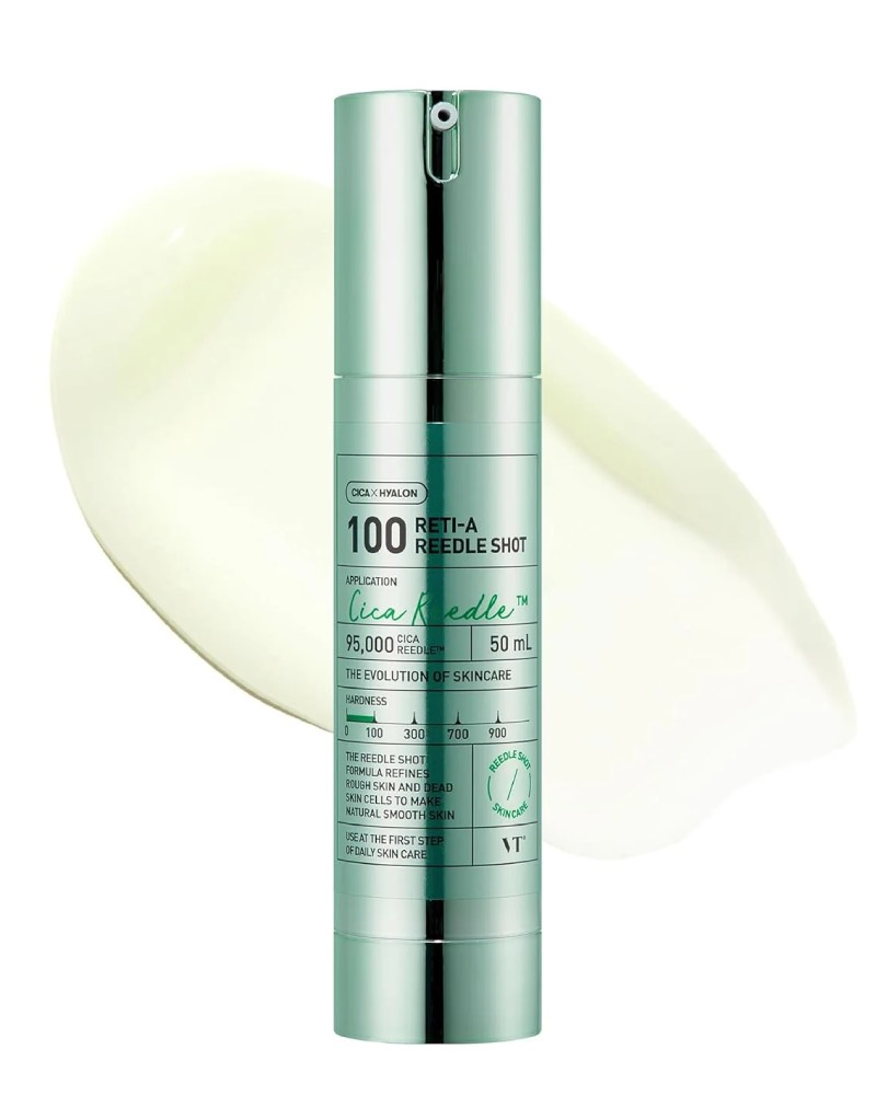 Boosterul-ser cu efect regenerant VT Cosmetics Reti-A Reedle Shot 100 stimulează reînnoirea celulară, estompând vizibil liniile fine, porii dilatați, hiperpigmentarea și urmele post-acneice.